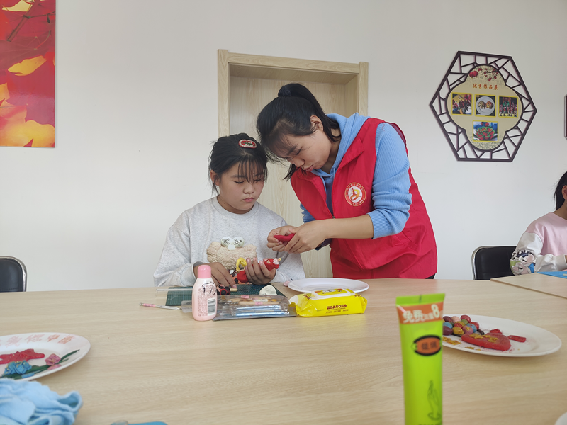 10月14日,志愿者在南张村新时代文明实践驿站非遗传承室传授孩子非遗技艺。新华网 李然 摄