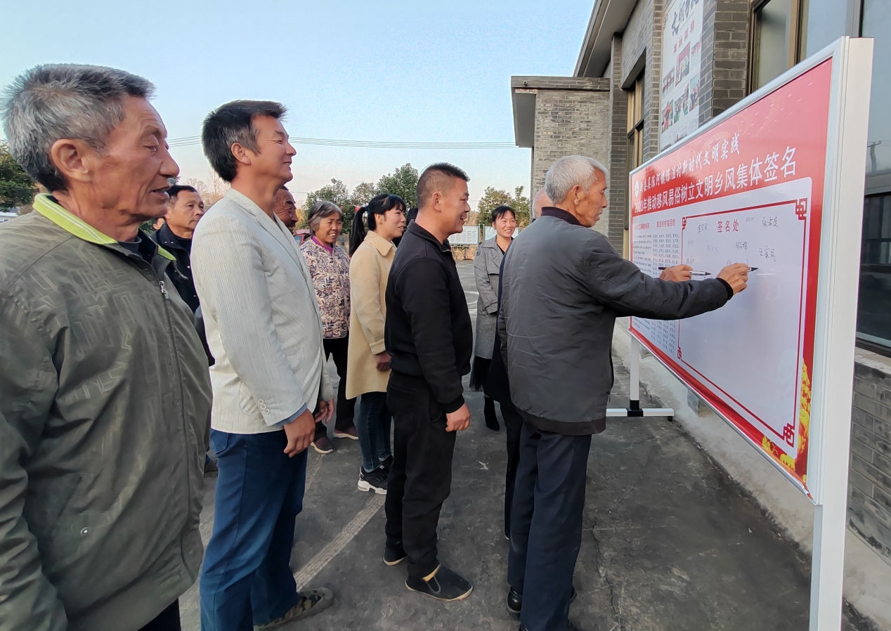 陈洼村党员群众在文明乡风签名墙上集体签名。