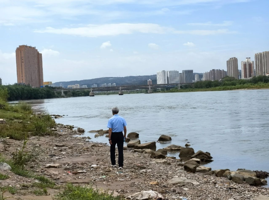 8月9日,黄河岸边张旭峰的背影。新华网发 山西日报 梁尚蓉 摄