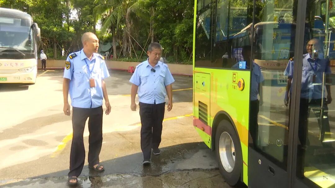 在海口公交世纪公园场站,刘筱杰正在与司机一起,按要求对即将发车的公交车进行检查。每次当班,他都会提前半小时到岗,认真做好车况车容车貌检查、驾驶员酒精检测等工作,把好行车安全关。